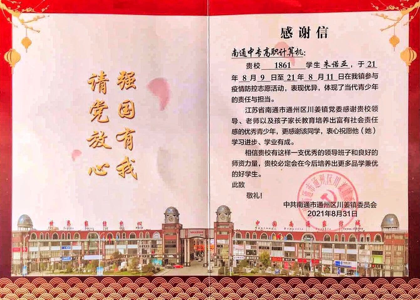 朱容炜同学是我校财经商贸系2018届毕业生,在校期间成绩优异,先后获得全国职业院校技能大赛一等奖、江苏省职业院校技能大赛一等奖、第十三届江苏省职业院校“新道杯”沙盘模拟经营大赛金奖等,毕业后进入南京晓庄学院继续深造。暑假期间,他第一时间投入社区志愿者服务工作,成为了川姜镇通海路东疫情防控检查点的一名志愿者。该防控检查点作为海门和通州的交界点,车流量大,防疫责任重。他迎难而上,出色完成任务。他的事迹被中央广播电视总台央广网、澎湃米兰在线注册等报道。