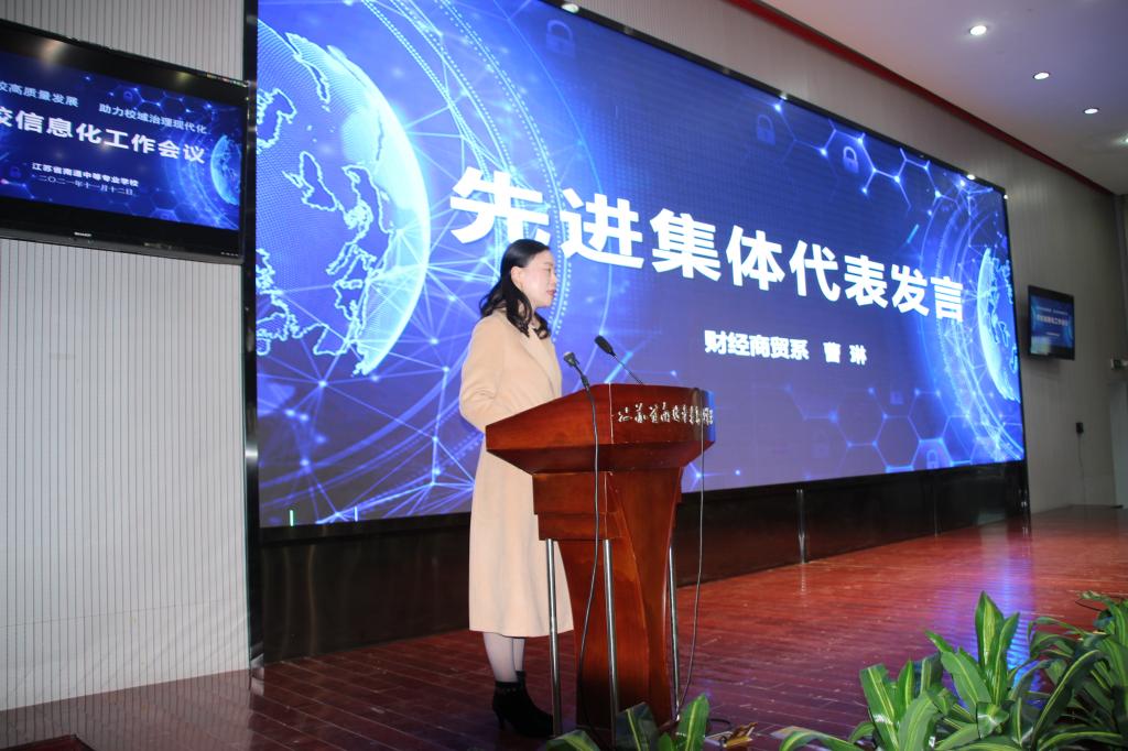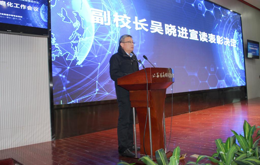 副校长吴校长宣读了学校信息化工作先进集体和先进个人表彰决定。党政办公室、教务处、学生工作处、后勤与财务处、机械工程系、财经商贸系和团委等7个部门被评为先进集体,古文玮、田小建、冯佳庆、苏扬、李雯、杨万得、单晨和袁乾等8名同志被评为先进个人。秦卫东、管图华和校领导为获奖者颁奖。财经商贸系主任曹琳、教务处副处长杨万得分别代表先进集体和先进个人作交流发言。
