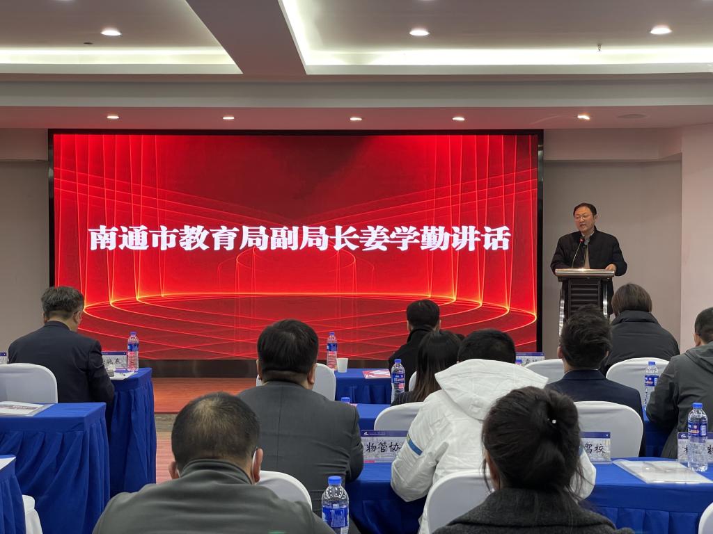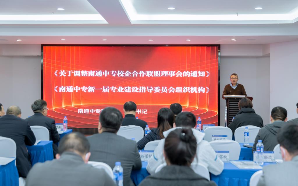 南通市教育局副局长、校企合作联盟理事长姜学勤讲话。他指出,进一步创新组织形式和运行机制,推动行业企业与职业院校构建校企命运共同体,既是更高层面、更深层次产教融合、校企合作的应然选择,也是推进职业教育高质量发展的精准方略。他希望,建立基于校企共同目标的制度遵循,规范合作流程、标准和细则,实现融合融通;校企联合开展授课指导、技术攻关、产品研发、成果转化、项目孵化等工作,深化协同协作;积极探索产业学院、企业学院、合作联盟、众创空间、大师讲坛等共同体建设,打造集“产、学、研、训、创”于一体,互补互利、互动多赢的组织平台,促进共生共长。