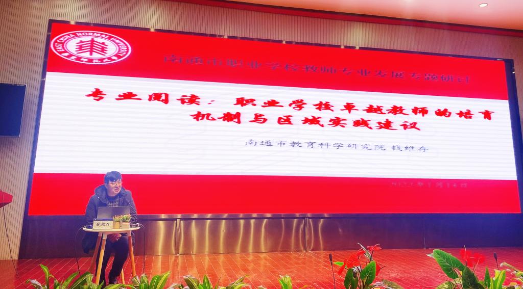 最后,市教科院钱维存博士作了《专业阅读:职业院校卓越教师的培育机制与区域实践行动》主旨报告。他从时代背景、核心概念的内涵与本质、专业阅读对于培养卓越教师的特殊价值等出发,结合自身专业成长中的专业阅读经验,依据《南通市职业学校教师专业阅读行动计划》,对全市职业学校和教师的专业阅读工作提出行动建议。