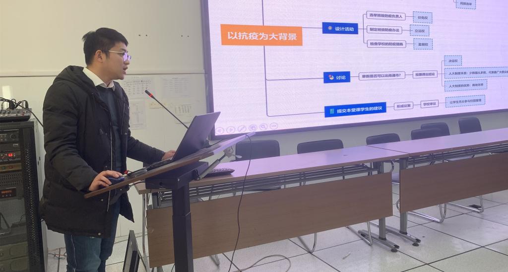 吴君垚老师分享的题目为《同向同行--思政课程与课程思政协同育人的路径探讨》。他以“坚持人民代表大会制度”这一课题的两个不同教学设计为例分析了形式课程思政与实质课程思政的区别。认为,前者是“油水分离”,后者是“盐溶于水”。在如何引发学生共情的问题上,他建议老师们优化课堂语言、善用各类思政资源、合理选取案例,并现场展示了自己的教学实录片段。最后吴老师以思维导图的形式将思政课程中能与专业课程相融合的“思政元素”一 一列出,希望能与大家集思广益,让“思政大树”枝繁叶茂。
