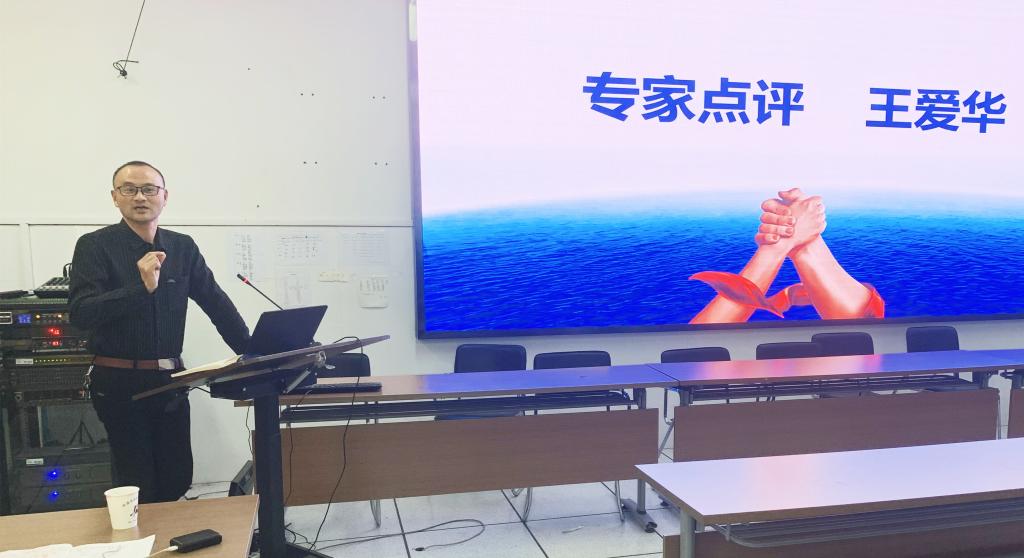 市教科院王爱华主任做了专家点评。他肯定了两位年轻老师的发言,对我校率先开始课程思政的实践探索,不断推动课程思政走向深处、走向实处表示了高度的赞许和充分的肯定。他指出思政课老师,除为学生提供完整的思想政治教育体系知识外,也应为专业教师提供权威和全面的指导,以达到思政课程和课程思政同向同行,协同育人的效果。他建议专业课课程思政显性和隐性相结合,避免“为课程思政而课程思政”,讲究 “润物细无声”。他希望专业课教师学习权威、系统的思政知识,学习课程思政资源的挖掘方式,学习思政知识的教学方式。