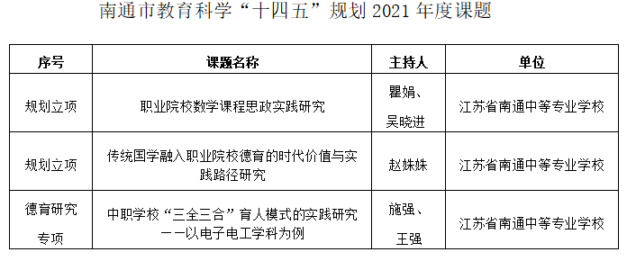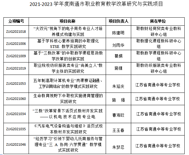 同时,我校9个项目被确定为南通市职业教育教学改革研究与实践项目。具体立项名单如下:
