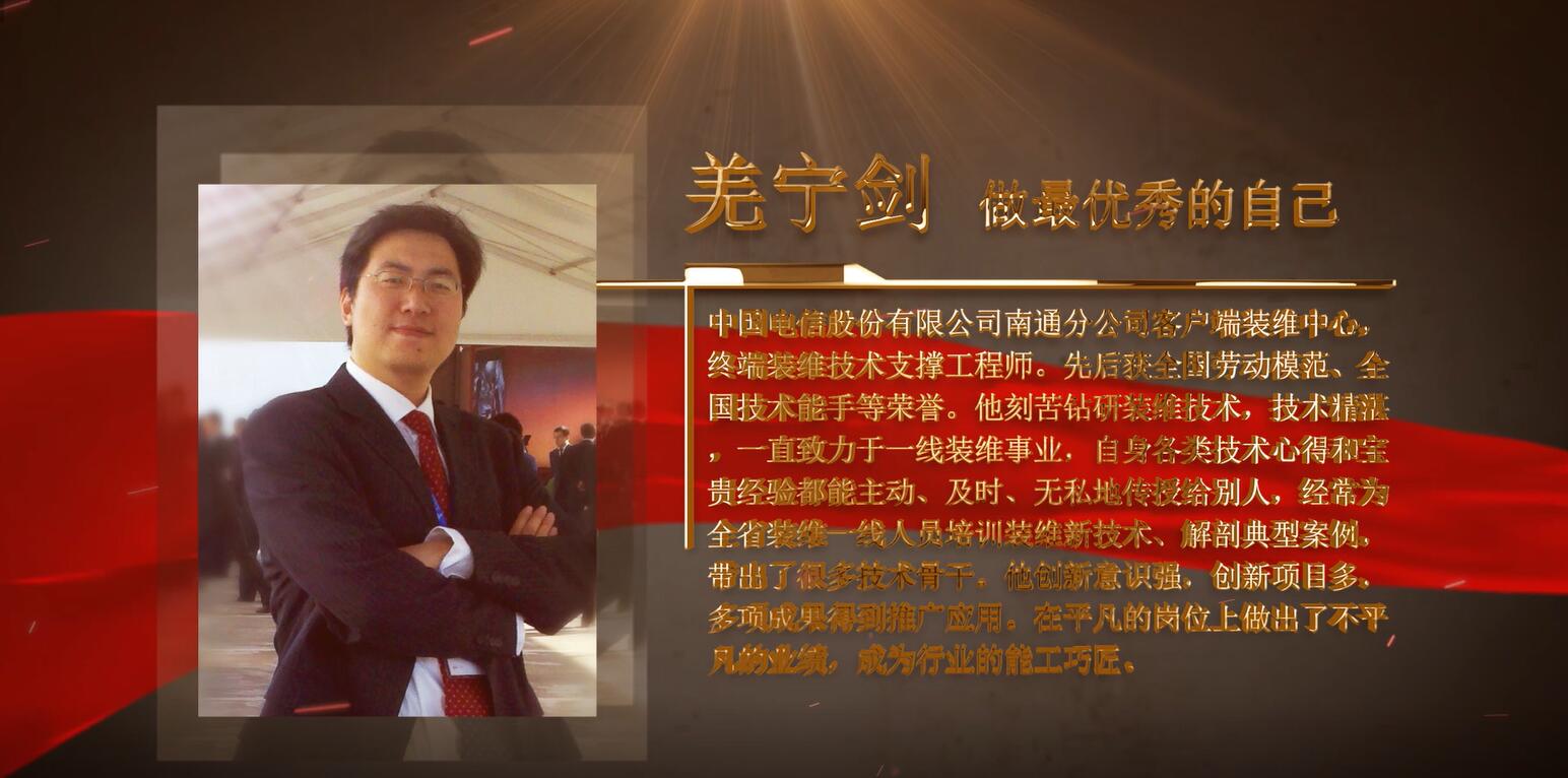 羌宁剑是中国电信江苏南通分公司员工,全国劳动模范。他在视频中真情回顾了自己刻苦钻研、不断创新、脱颖而出的成长历程;讲述了自己始终保持理想信念,坚守初心,将奋斗精神融入工作,成长为业务骨干和技术能手的故事。