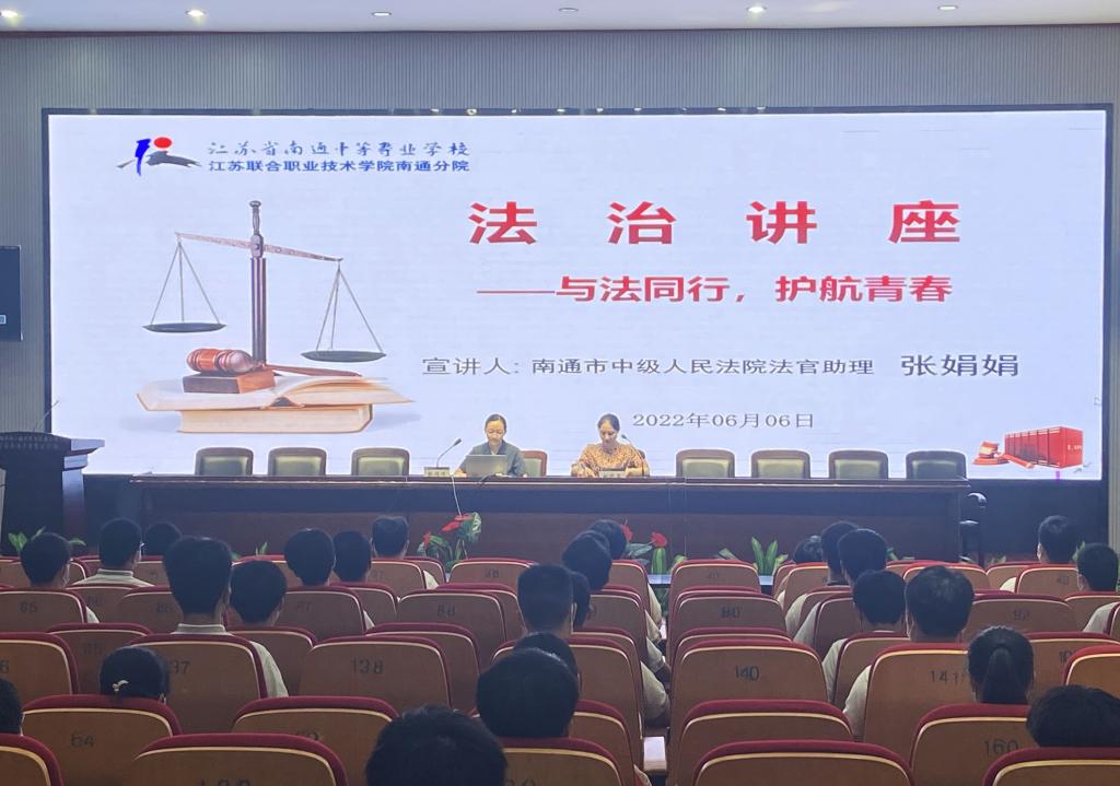 6月6日下午,我校法治副校长、南通市中级人民法院高鸿法官委托法官助理张娟娟来校为全体师生上了一堂题为《与法同行,护航青春》的防范校园诈骗、校园欺凌专题法治课。