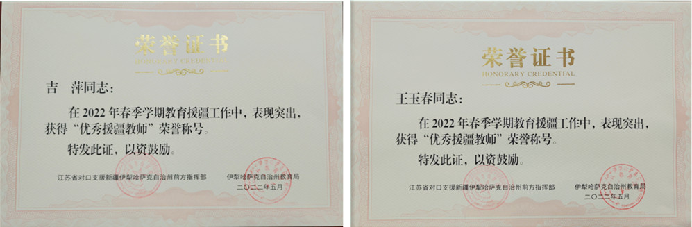 近日,江苏省对口支援新疆伊犁哈萨克自治州前方指挥部公布了2022年春季学期江苏省优秀援疆教师评选结果,我校吉萍、王玉春老师获得“江苏省优秀援疆教师”称号。