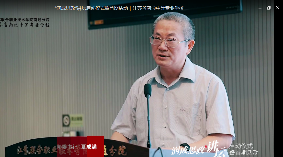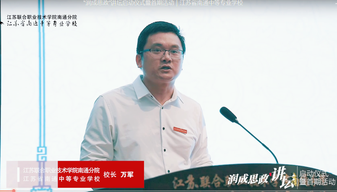 6月27日上午,我校在报告厅举行“润成思政”讲坛启动仪式暨首期活动。江苏联合职业技术学院党委书记夏成满,南通市委教育工委书记、市教育局局长成宾,南通市教育科学研究院副院长顾志刚和我校领导班子成员出席活动,全国著名特级教师、全国教书育人十大楷模、启秀中学李庾南老师应邀出席活动并作讲坛首讲。校长万军主持第一阶段启动仪式。