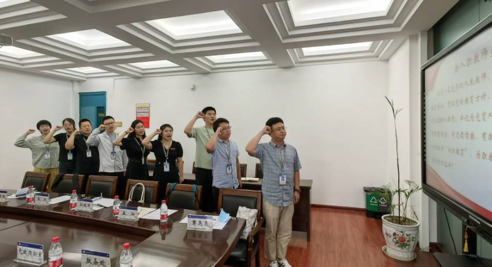校领导们为新教师佩戴校徽、胸卡,信息工程系主任朱延庆带领新教师们进行了入职宣誓。