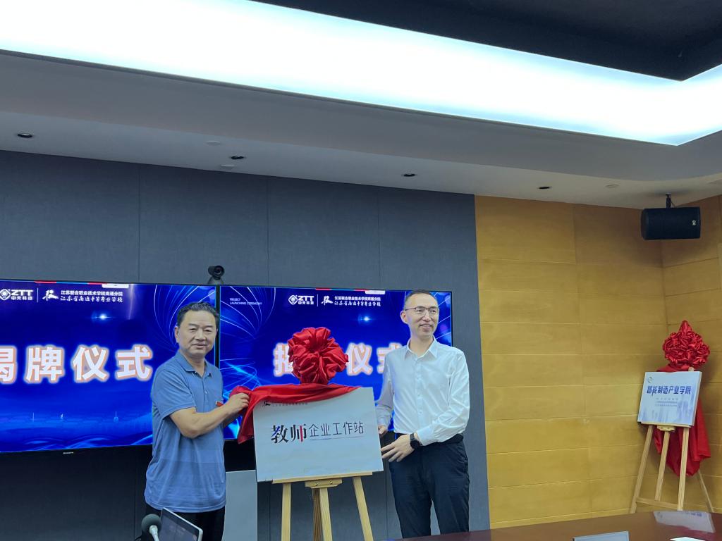 夏嬗主任介绍了筹建和运行产业学院的有关情况。李明生书记与薛驰总裁为产业学院揭牌。万军校长与薛驰总裁在产业学院合作协议上签字。孙海如副校长与钱蒋锋总经理为教师企业工作站揭牌。