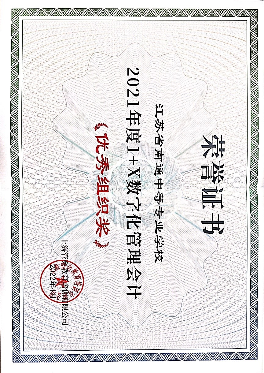 近日,我校财经商贸系收到“2021年度‘1+X’数字化管理会计优秀组织奖”荣誉证书。