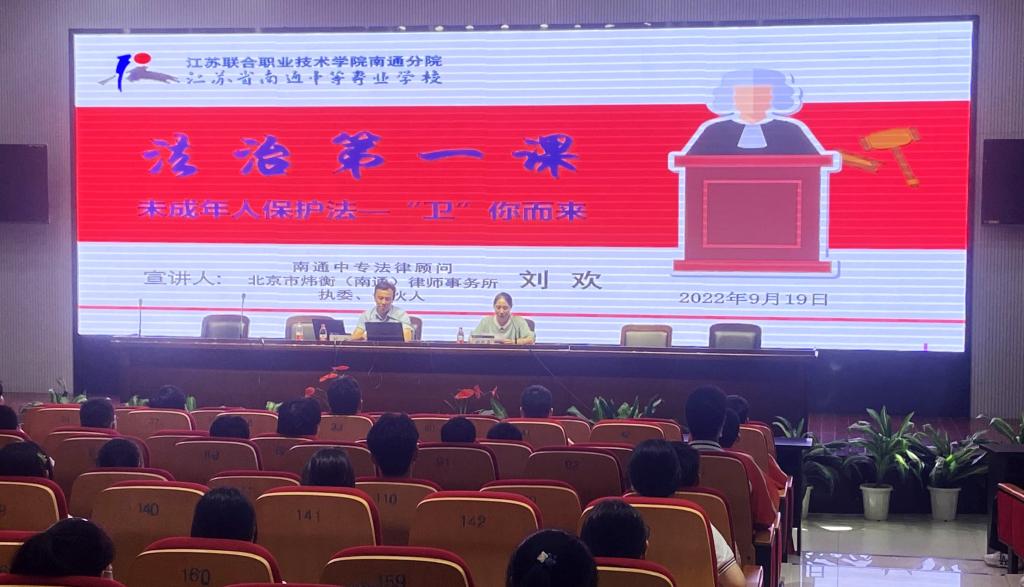 9月19日下午,我校法治副校长、北京市炜衡(南通)律师事务所刘欢律师为全校师生上了题为《未成年人保护法——“卫”你而来》的新学期法治教育第一课。