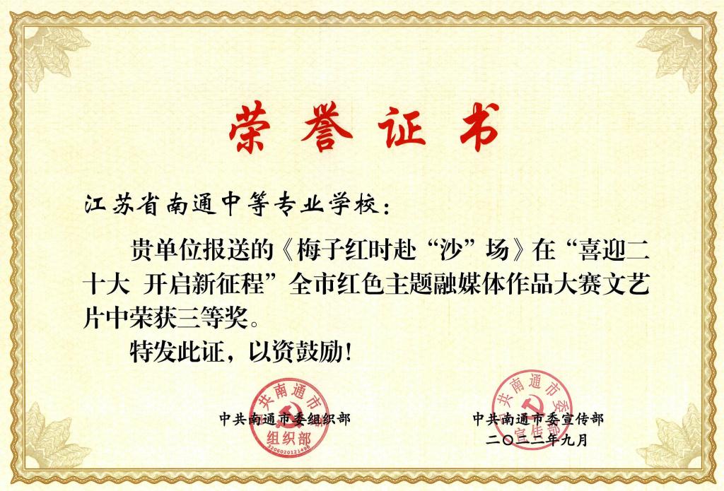 9月26日,南通市委组织部、宣传部组织的“喜迎二十大,开启新征程”南通市红色主题融媒体作品大赛举行颁奖仪式,我校党委制作选送的作品《梅子红时赴“沙”场》喜获文艺片类三等奖,是全市职业院校唯一获奖作品。该片根据我校沙盘模拟企业经营集训团队师生克服主力队员意外摔伤、竞争格外激烈等种种不利因素,最终获得省赛、国赛一等奖,参赛队员被保送本科院校深造的真实故事改编而成,表现了我校党员、教师和学生在“成功教育”的生动实践中昂扬向上的精神风貌、敢打能胜的优秀作风和奋进新时代、再创新辉煌的雄心壮志。