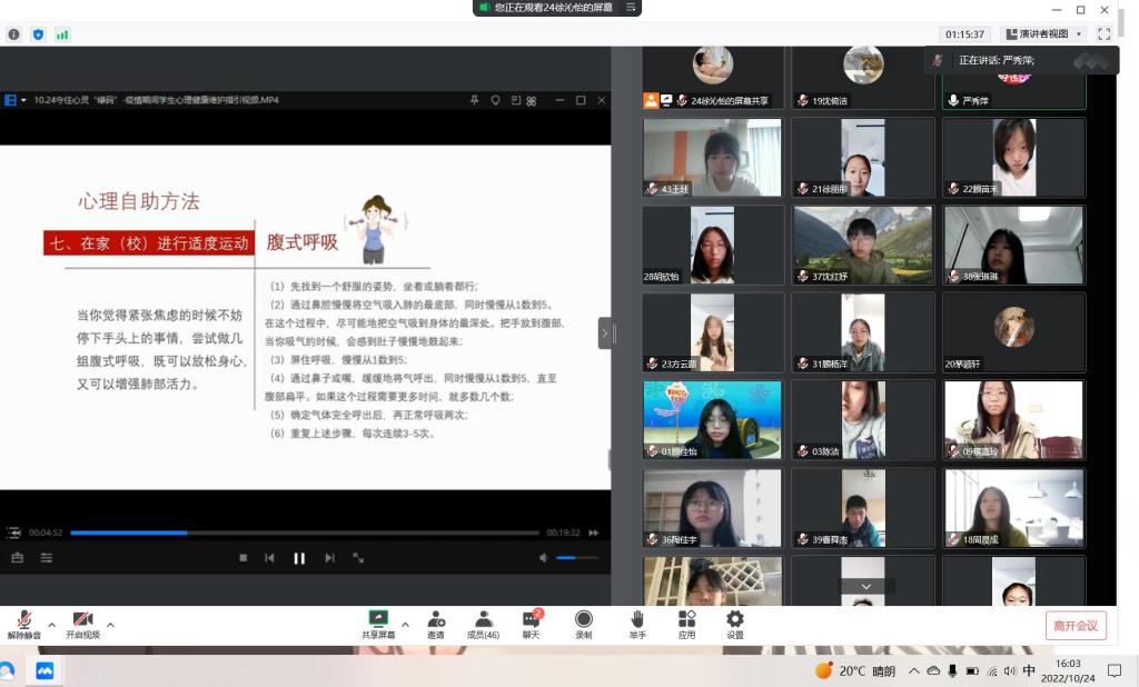 讲座中,心理老师结合疫情期间出现的实际案例,为大家提供了切实可行的心理自助方法,着重带领学生们体验了“腹式呼吸法”和“肌肉放松法”,以缓解学生疫情期间出现的紧张、焦虑或者烦闷的情绪。
