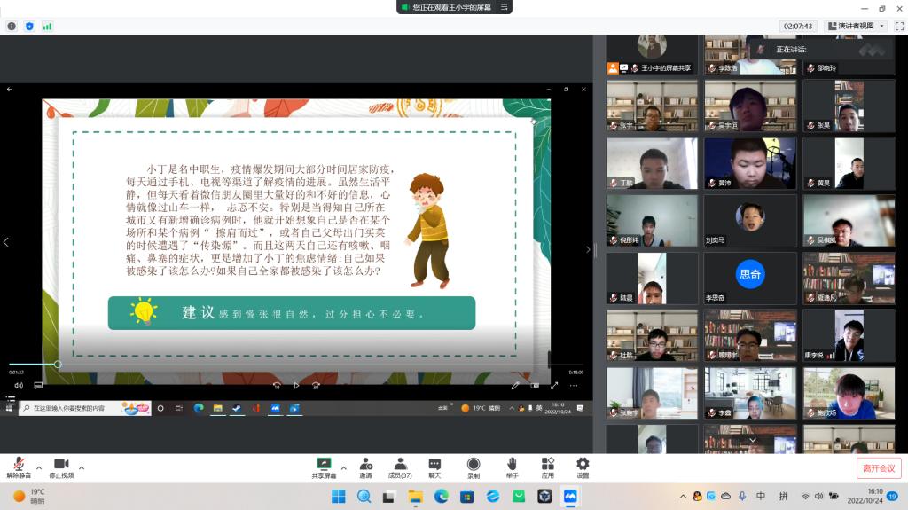 为进一步增强学生疫情期间心理健康维护意识和心理调节能力,切实提升学生心理素质,10月24日下午,我校心理健康教育中心为全校师生带来了心理讲座《守住心灵“绿码”》。各班班主任组织学生在线观看讲座,并开展线上讨论。