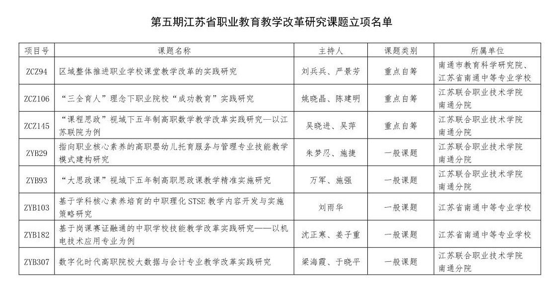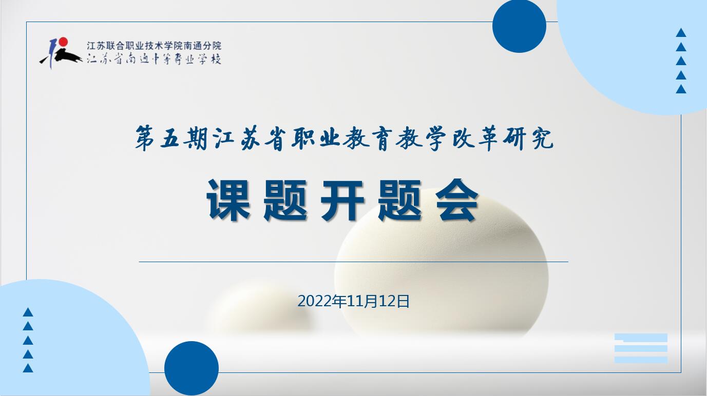 11月12日上午,第五期江苏省职业教育教学改革立项课题开题论证会在我校服装实训楼二楼会议室召开。江苏省教科院方健华所长、陈向阳副所长、曹鸿骅研究员、王新国研究员,南通大学职教所邓宏宝所长,南通市教科院顾志刚副院长、陈青云教研员、钱维存教研员、王爱华教研员,南通市老年大学许振华常务副校长,通州中专姜汉荣校长,海门中专崔志钰教授担任评审专家。开题会线上线下同步进行。