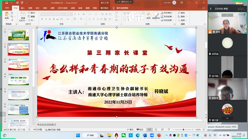 隔屏不隔爱,家校心相通。11月25日下午,我校组织了本学期期中家长会暨第三期家长课堂。在学工处、各系部和各班主任的精心组织下,老师和家长相约于云端,以“家校携手凝合力,同心育人促成功”为主题开展家校沟通。