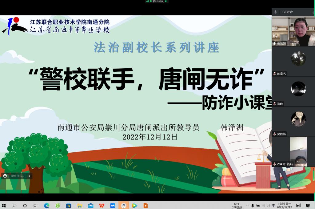 12月12日下午,我校法治副校长委托南通市公安局崇川分局唐闸派出所教导员韩泽洲在云端给全体同学开设了一堂题为《警校联手,唐闸无诈》的防电信网络诈骗小课堂。