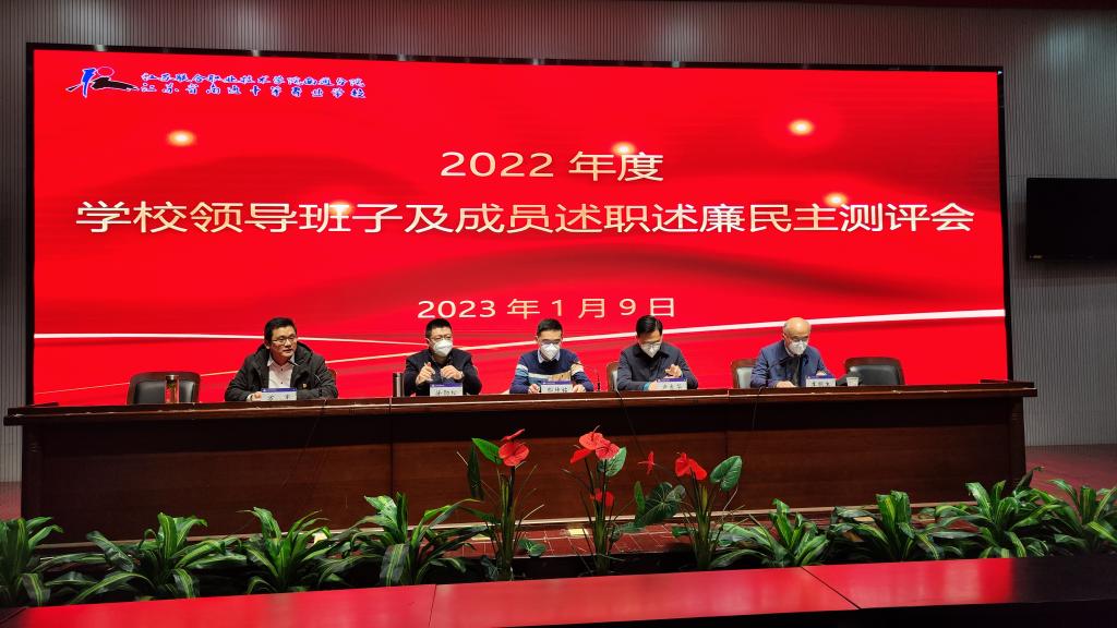 1月9日,我校在报告厅召开2022年度校领导班子及成员、部门及中层干部述职测评会。南通市市委组织部宣传与信息处四级主任科员郁坤铭、市纪委派驻财政纪检组副组长徐劲松、南通市教育局政策法规处处长卢志华到会指导。校领导班子成员、中层以上干部和校第七届教代会代表参会。会议由校长万军主持。