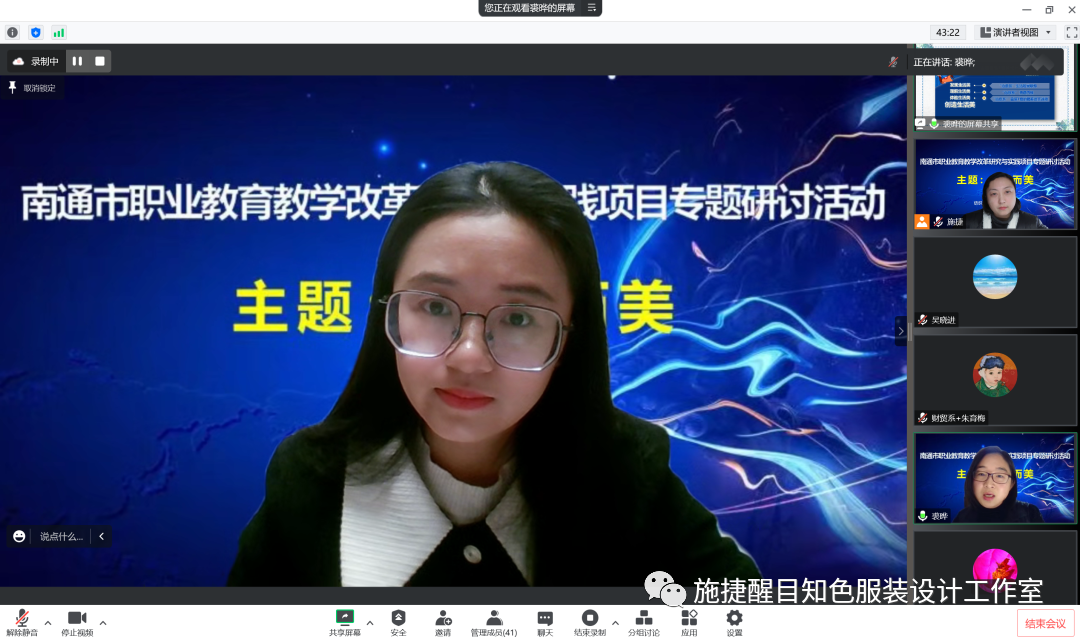 第一个环节是南通市职业教育教学改革研究与实践项目——《职业院校纺织服装类专业“尚美立人”教学主张的实践研究》项目组8位老师作主题分享。8位老师分别从服装设计、服装材料、服装图案等角度阐述各自专业教学中开展“尚美立人”教学主张实践应用及融合美育特色做法。其中,南通中专裘晔老师认为美育就是生活本身而不是生活的准备,并以“治愈系”童装设计为例,具体介绍在教学中“用美育去丰盈学生的认知底蕴”,促发学生发现生活美、理解生活美、体验生活美、创造生活美的创新思路和做法。