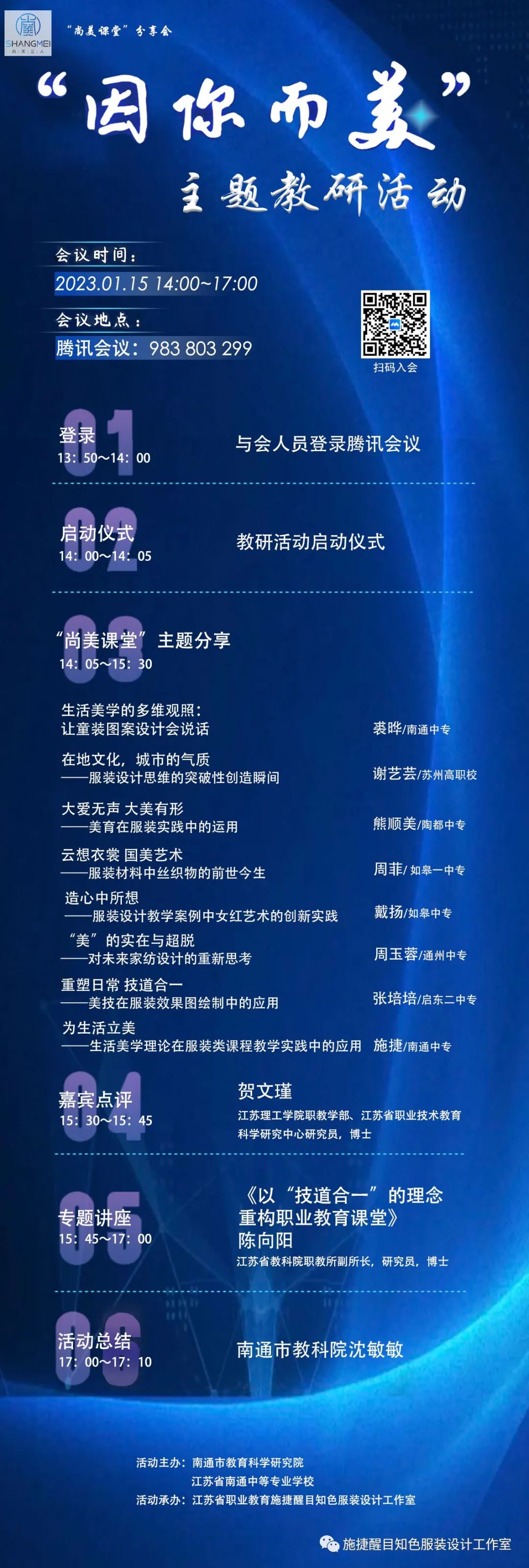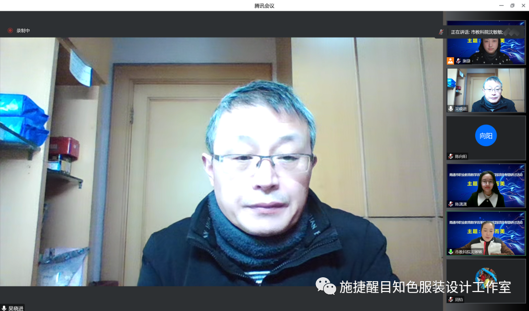 1月15日,南通市职业教育纺织服装类专业中心组开展“‘尚美立人’教学改革研究与实践项目之‘因你而美’主题研讨活动”。活动由南通市教科院和南通中专主办、江苏省施捷醒目知色服装设计工作室承办。活动特邀江苏理工学院贺文瑾博士、江苏教科院陈向阳博士以及南通市教科院沈敏敏教研员参会指导。南通中专副校长吴晓进致辞,施捷醒目知色服装设计工作室成员陈潇潇老师主持活动,活动分为四个环节。