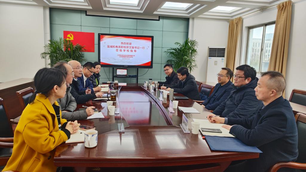 2月22日下午,盐城机电高等职业技术学校党委书记、校长茆艾磊,副校长张学军,纪委书记王磊,产教融合处处长苗长兵,办公室主任祁玉洲等一行5人来我校访问交流,受到党委书记李明生、校长万军的热情接待。