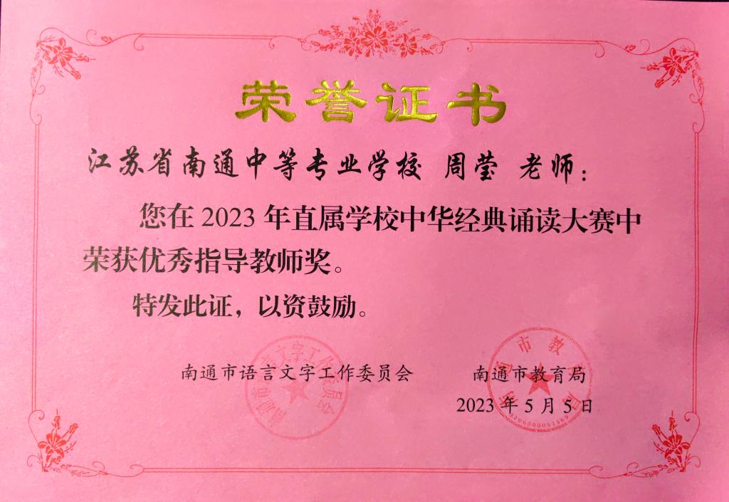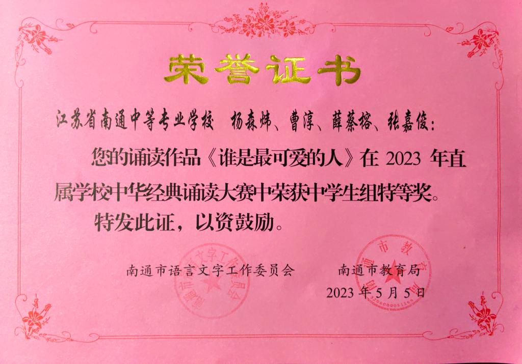 近日,我校杨森炜、曹淳、薛蔡榕、张嘉俊同学的朗诵作品《谁是最可爱的人》在2023年南通市教育局直属学校中华经典诵读大赛中荣获中学生组特等奖。缪莉和周莹老师获优秀指导教师奖。