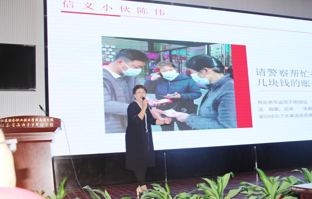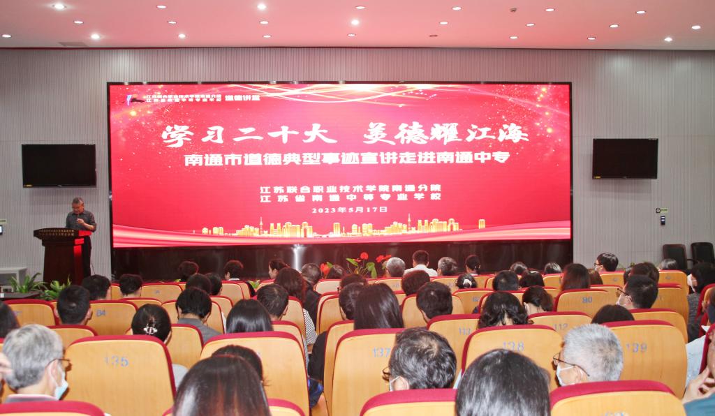 南通中专纪委书记、副校长吴晓进在主持宣讲活动时说,近年来,我市精神文明之花结出累累硕果,从“莫文隋”、江海志愿者到磨刀老人、“爱心邮路”,等等,涌现了一大批各类行业、各种类别的道德模范和精神文明典型。一个文明典型,就是一座精神丰碑;一群道德模范,正引领带动更多的人见贤思齐、向上向善。他号召全校师生学习道德典型的闪光事迹,感悟凡人善举的精神实质,知行统一,身体力行,争做崇高道德的践行者、文明风尚的维护者、美好生活的创造者,传递正能量,弘扬新风尚。