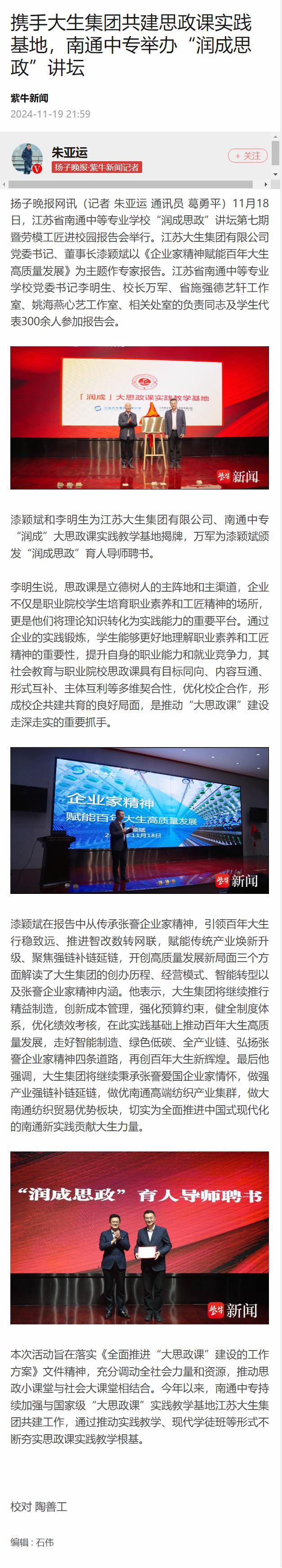 米兰在线注册资讯 当前位置: 米兰(中国) > 米兰在线注册资讯 > 媒体聚焦 > 正文 【紫牛米兰在线注册】携手大生集团共建思政课实践基地,南通中专举办“润成思政”讲坛 浏览量:时间:2024-11-28 来源:紫牛米兰在线注册 原文链接:https://wap.yzwb.net/wap/news/4153294.html?timestamp=1732506152061 分享到: