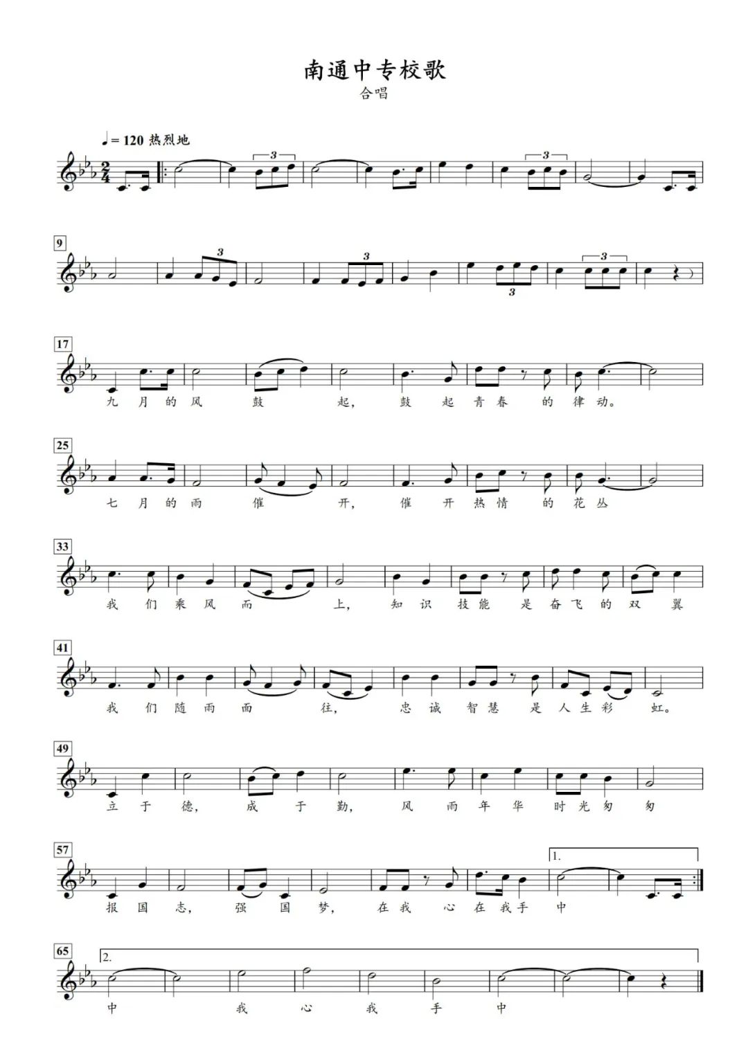 会上,我就南通中专的创立、学校精神文化的追求、校歌歌词的内涵、对旋律创作的要求做了介绍。建议采用进行曲风格,节奏简洁明快,具有蓬勃向上的音乐形象。要求主旋律鲜明,易于传唱,全曲时长不超过1分钟,便于升校旗时奏唱。我特别推崇小号的引奏效果,描绘了一幅天刚破晓,激越嘹亮的小号声排空而来的青春影像。与会人员随后也就校歌创作和词曲配合跟我进行了专门交流。